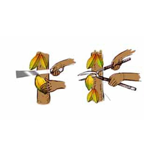 ในปีแรกหลังการปลูก ควรทำการตัดแต่งกิ่งรอบๆ ทรงพุ่มของโกโก้ทุก 60 วัน เพื่อช่วยให้ต้นโกโก้เจริญเติบโตและตั้งเรือนยอดหรือจุดคาคบ